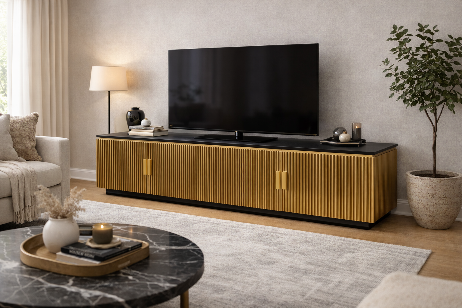 Crafted to make a statement, this luxury TV unit features a sculptural brass fluted exterior paired with a sleek black top for a bold contemporary......